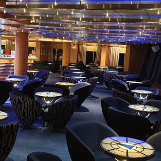 A giant wall of glass spans both levels and affords magnificent views of the ships' wake and at night, blue neon ceiling lights reflect beautifully off the window transforming it into a work of art.